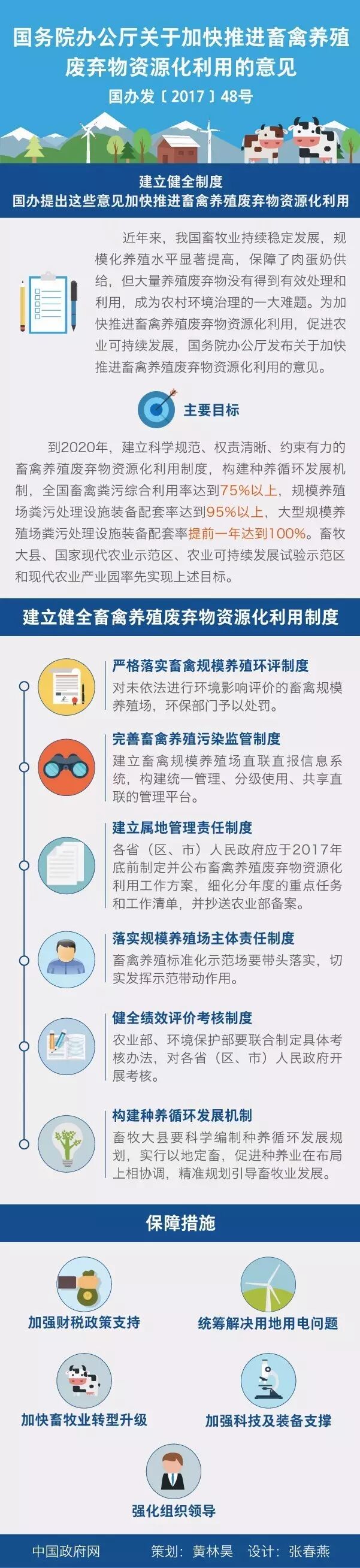 全面贯彻党的十八大和十八届三中、四中、五中、六中全会精神,深入贯彻习近平总书记系列重要讲话精神和治国理政新理念新思想新战略,认真落实党中央、国务院决策部署,统筹推进“五位一体”总体布局和协调推进“四个全面”战略布局,牢固树立和贯彻落实创新、协调、绿色、开放、共享的发展理念,坚持保供给与保环境并重,坚持政府支持、企业主体、市场化运作的方针,坚持源头减量、过程控制、末端利用的治理路径,以畜牧大县和规模养殖场为重点,以沼气和生物天然气为主要处理方向,以农用有机肥和农村能源为主要利用方向,健全制度体系,强化责任落实,完善扶持政策,严格执法监管,加强科技支撑,强化装备保障,全面推进畜禽养殖废弃物资源化利用,加快构建种养结合、农牧循环的可持续发展新格局,为全面建成小康社会提供有力支撑。